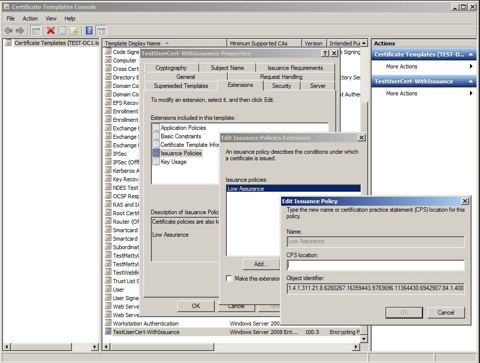 So the Issuance Policy Extension (also known as the Certification Policy) on the Certificate Template ‘TestUserCert-WithIssuance’ has the Low Assurance Issuance Policy associated.