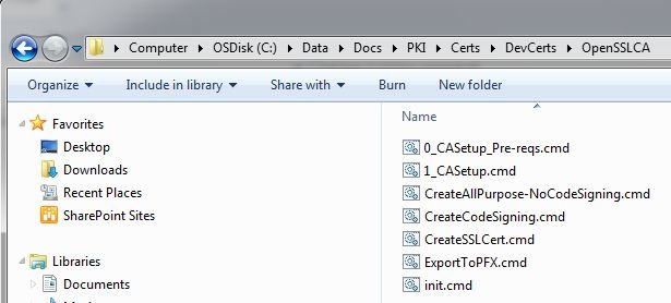 Create a directory in which to deploy all the required batch files. In my case, I created a directory called C:\Data\Docs\PKI\Certs\DevCerts\OpenSSLCA. Within this directory create the following files: